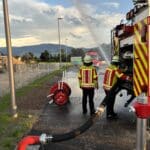 Ein weiterer Schwerpunkt liegt auf der praxisgerechten Löschwasserbereitstellung. Ein Teil des Wassers aus dem Stauraumkanal wird über einen genormten Sauganschluss durch Feuerwehrpumpen entnommen. Je nach Pumpenmodell können hier u.a. Förderleistungen von 800 bis zu 2.000 Litern pro Minute erreicht werden – Werte, die auch im realen Einsatzgeschehen auftreten. Dank des großen Speichervolumens lassen sich selbst Übungen mit hohem Wasserbedarf realistisch durchführen. Über den geschlossenen Wasserkreislauf wird das eingesetzte Wasser in die Zisterne zurückgeführt und steht damit für weitere Übungen zur Verfügung.