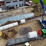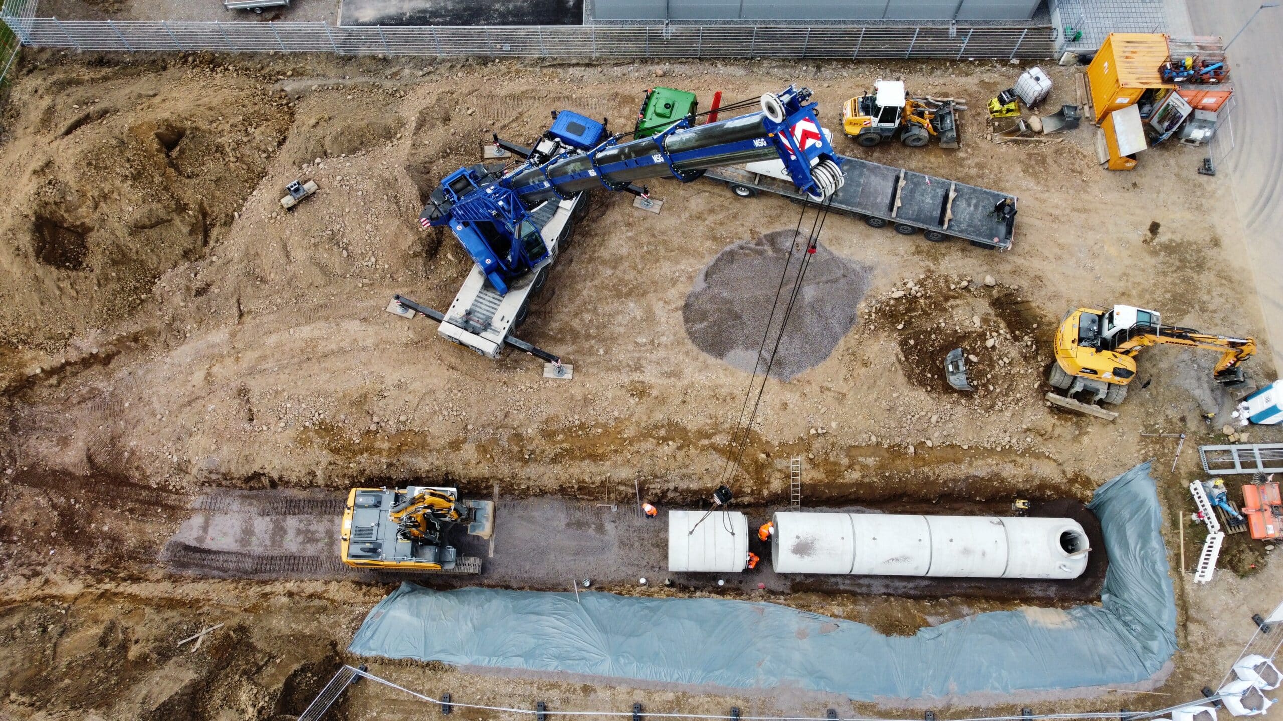 Die Verlegung des Stauraumkanals – insgesamt 36 lfm Rohrstrang – wurde in ca. 8 Stunden (ohne Erdarbeiten) abgeschlossen. Die Rohre wurden Just-in-Time von regionalen Speditionen angeliefert. Mithilfe eines Mobilkrans erfolgte das Einheben in die Baugrube, anschließend schob der ohnehin für die Erdarbeiten eingesetzte Bagger die Rohre zentrisch ein. Für die Baufirma bedeutete dies eine einfache und zugleich äußerst effiziente Verlegung.