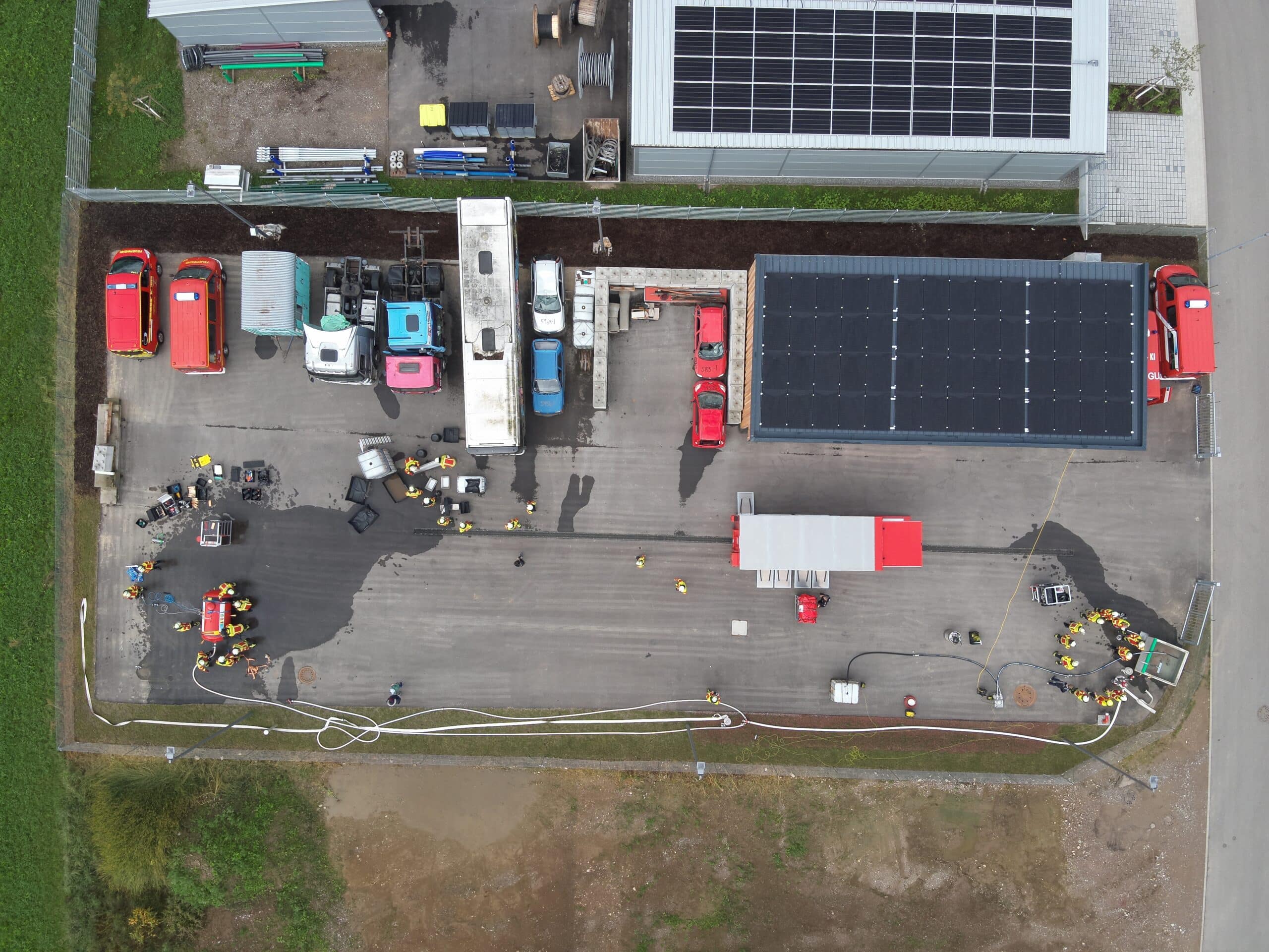 Für realitätsnahe Einsatzübungen wird nicht nur spezielles Material benötigt, sondern auch ausreichend Platz. Größere Szenarien lassen sich nur dann authentisch trainieren, wenn Raum für die Bewegung von Fahrzeugen, Geräten und Einsatzkräften zur Verfügung steht. Auf dem neuen Gelände sind diese Voraussetzungen gegeben: Die großzügige Lager- und Übungsfläche kann flexibel für den Aufbau von Übungslagen genutzt werden, etwa mit LKWs oder Bussen für die technische Rettung. Zudem bietet sie Stellmöglichkeiten für Abrollcontainer, die im Einsatzfall schnell und gezielt bereitgestellt werden können.