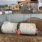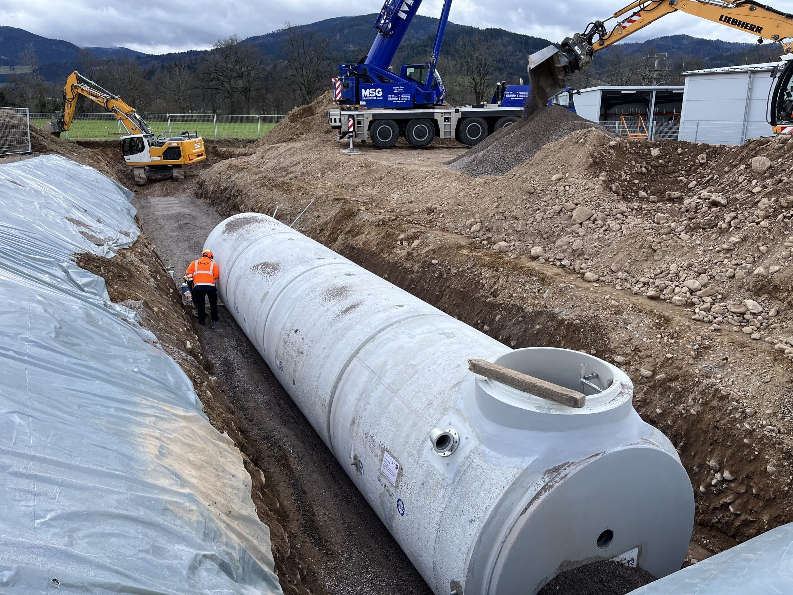 Nach sorgfältiger Prüfung verschiedener Bauweisen entschied sich die Gemeinde für den Einbau von Stahlbetonrohren DN 2000 als Stauraumkanal. Diese Lösung erwies sich als die beste Kombination aus Belastbarkeit, Wirtschaftlichkeit und Nachhaltigkeit und erfüllt damit die Anforderungen der neuen Übungs- und Lagerfläche optimal.