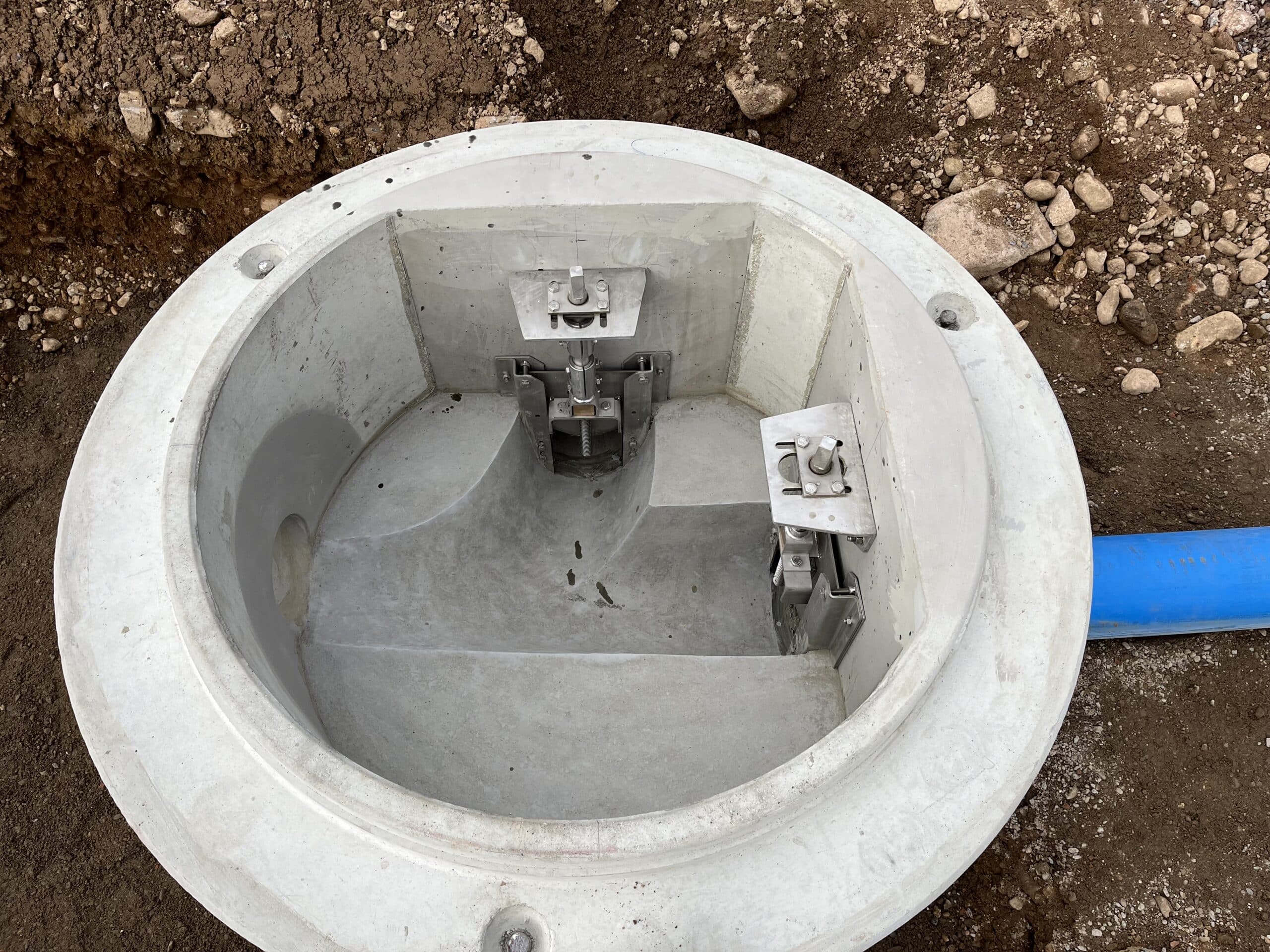 Zur zukünftigen Sicherstellung eines flexiblen Betriebs wurde ein Trennschacht in Nennweite DN 1000 ausgeführt. Dieser ist mit zwei werkseitig eingebauten Schiebern ausgestattet. Über die Schieber lässt sich der nachgeschaltete Stauraumkanal bei Bedarf vollständig absperren, sodass das anfallende Oberflächenwasser kontrolliert am Stauraum vorbei in den weiteren Kanalstrang geleitet wird.