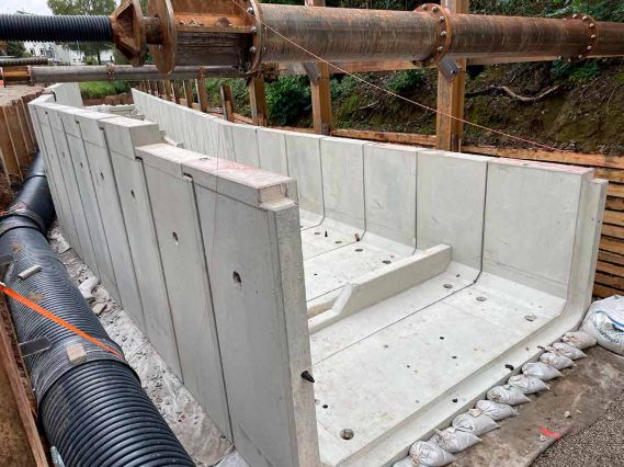 Der Grundgedanke für die in Steinbach angewandte Lösung war auf der letzten IFAT in München zu sehen. Konstruktiv abgeleitet aus einem Kastenprofil wurde hier das U-Profil mit einer integrierten Dichtung vorgestellt. „Ein Profil, das auf 4,00 Meter aufgeht, war dann aber auch für uns eine Überraschung. Aber wir haben es geprüft und sind zu dem Ergebnis gekommen, dass die konstruktiven Merkmale auch hier passen.“ Die Besonderheit bei nicht geschlossenen Profilen sei, dass sich die Muffe und das Spitzende durch den Anpressdruck der Dichtung gegenseitig aufstellen wollen. Dieses Problem habe man mit einer Langmuffe und mit Scherlastbolzen gelöst. Das sind mit Kunststoff umspritzte Stahlbolzen, die beim Zusammenfügen helfen und für zusätzliche Lagestabilität in der Verbindung der Elemente sorgen. Um die Dichtung stirnseitig zu schützen, ist in die Fertigteile ein Abdeckstein integriert.