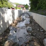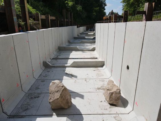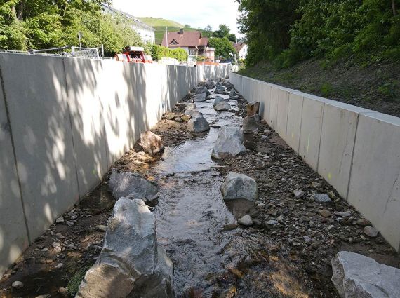 Alle fünf Meter sind wechselseitig Querriegel angeordnet und Verankerungen einbetoniert, um dem alten Bachbett entnommene sogenannte Störsteine im Fließweg des Wassers dauerhaft zu fixieren. So wird ein Ausschwemmen des Substrates vermieden und der Bach hat trotzdem die Möglichkeit, sich dynamisch zu entwickeln, so wie es auch in der Natur einfach passiert.