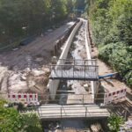 „Die große Herausforderung für uns als Bauunternehmen war der Bach an sich“, so Frank Jerger, Bauleiter bei der Josef Welle GmbH. Das Wasser wurde in einem 800er Rohr neben dem Verbau an dem jeweiligen Bauabschnitt vorbeigeleitet. Bei stärkeren Niederschlägen schwillt der Bach jedoch schnell über die Kapazitätsgrenze dieser Wasserhaltung an und überflutet das Baufeld. Dies kam in dem außergewöhnlich niederschlagsreichen Juli unerwartet häufig vor. Versetzt wurden die Elemente auf eine mit Vlies umhüllte Kies- und Spilttpackung. Insgesamt habe der Einbau aber sehr gut funktioniert, sagt Frank Jerger. Wesentlich für den Bauablauf sei es gewesen, seitens Beton Müller das richtige Bauteil zur richtigen Zeit zu liefern.